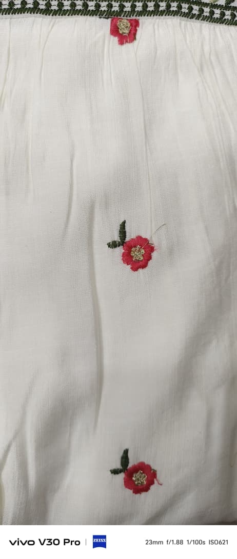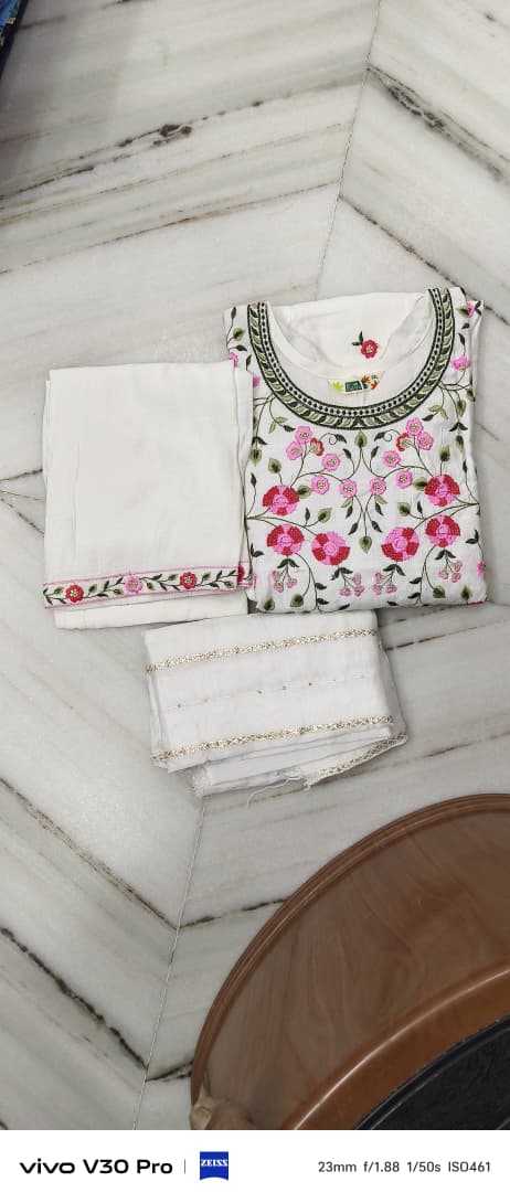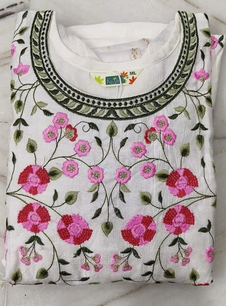 Add timeless charm to your wardrobe with this beautiful white embroidered kurti, crafted for women who love grace with comfort. The kurti features intricate floral embroidery in shades of pink, red, and green, giving it a fresh and elegant ethnic appeal. The round neckline with detailed embroidered border enhances the overall look, making it perfect for both casual and festive wear.